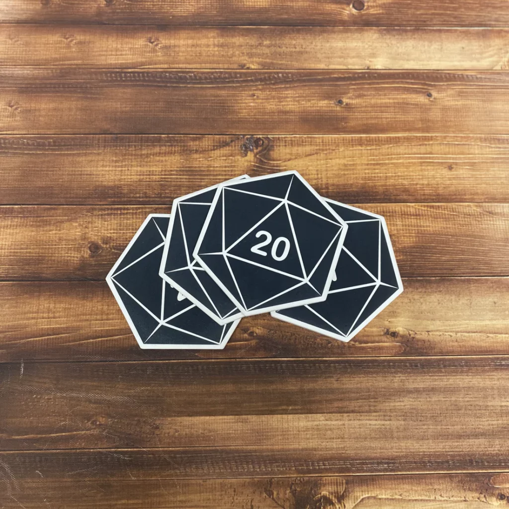 Protect that table from condensation (and coasters from boredom). D20 coasters or Catan-inspired sets keep things tidy and nerdy.