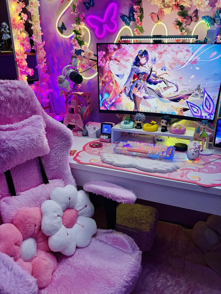 A pastel dream that merges anime fantasy with floral softness, this setup glows with personality. Neon butterflies, sakura vines, and plush textures frame a stunning anime display, creating an enchanted vibe that feels straight out of your favorite magical world.