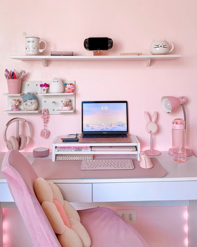 Soft pink and crisp white come together in perfect harmony in this adorable setup. A soft rug, matching plushies, and coordinated pink accessories make it equal parts cute, clean, and totally kawaii.