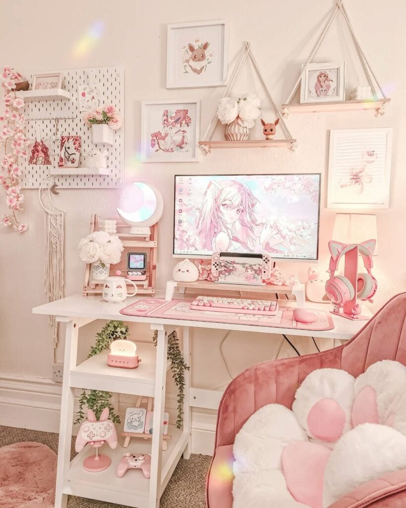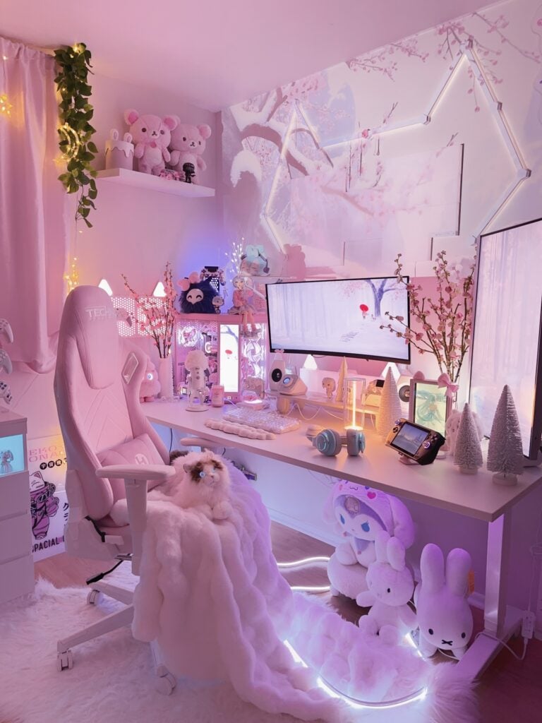 Overflowing with plushies, soft pink hues, and glowing fairy lights, this setup is a pastel paradise. It’s equal parts adorable and serene—a dreamy haven for lovers of all things cuddly and sweet.