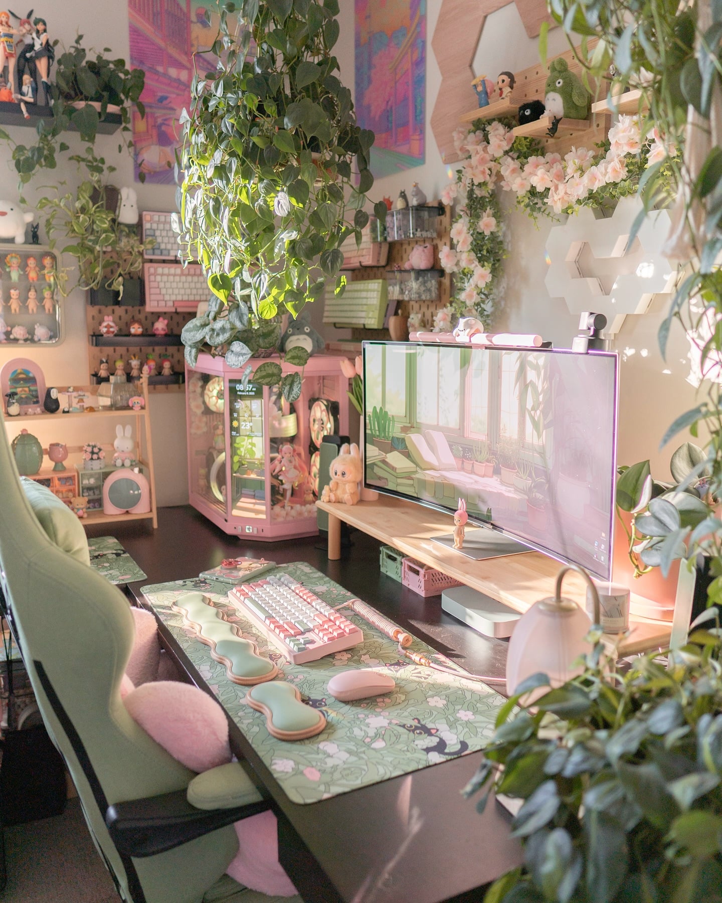 Trailing greenery and soft pink lighting bring a calm, organic feel to this space. A refreshing reminder that gamers are allowed to touch plants, even if they’re fake.